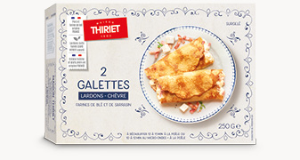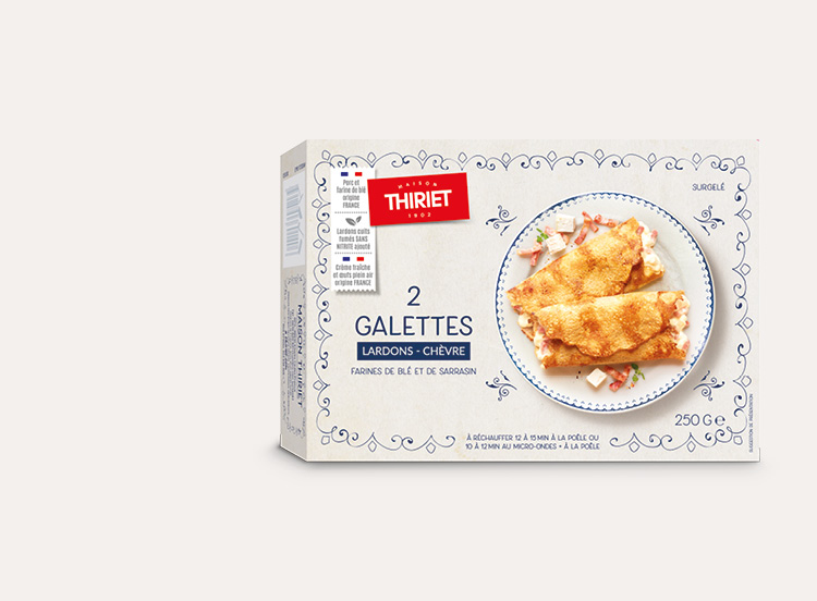 Deux délicieuses galettes, aux farines de blé et de sarrasin et aux œufs frais, garnies aux lardons cuits fumés sans nitrite ajouté (porc origine France), au fromage de chèvre et à la crème fraîche pour un cœur de repas savoureux.