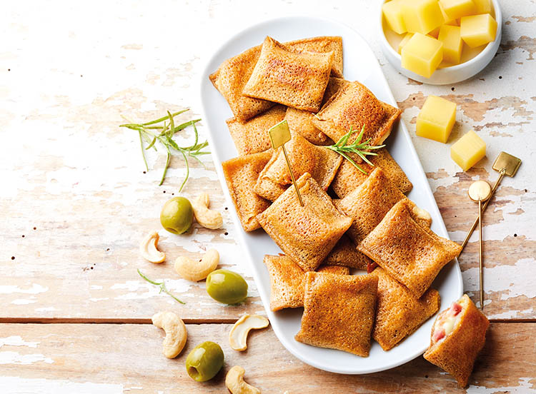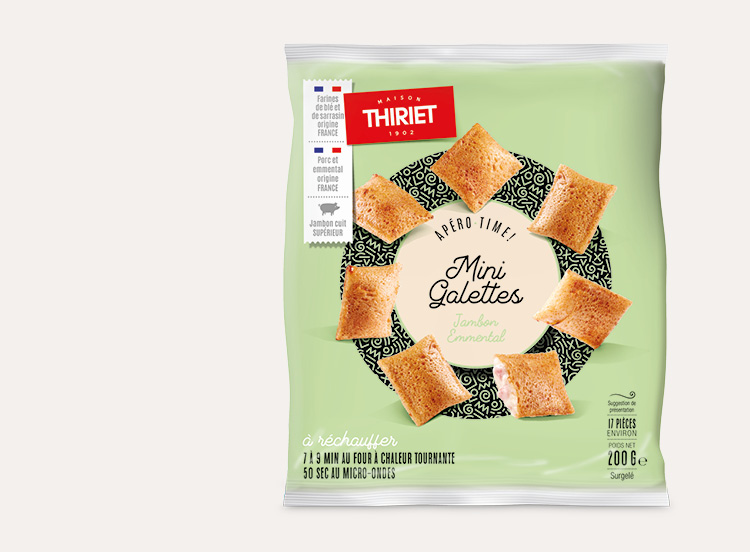 Découvrez nos galettes jambon emmental en version mini ! De délicieuses petites galettes aux farines de blé et de sarrasin origine France généreusement garnies de jambon cuit supérieur (porc origine France), d'emmental et de crème origine France. Un apéritif qui vous rappellera la Bretagne !